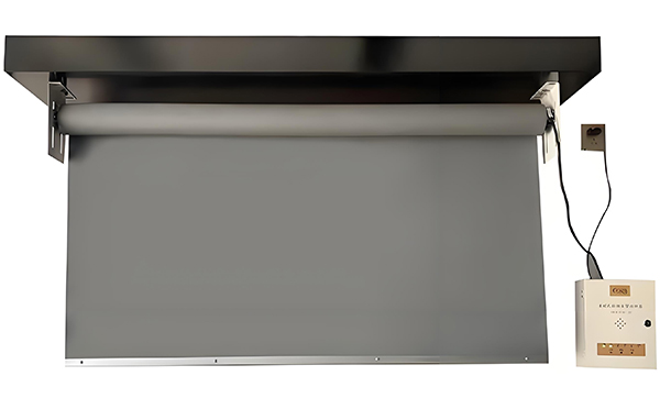 连接电源线和控制线,将木垒挡烟垂壁安装在支架上,并用螺丝固定。